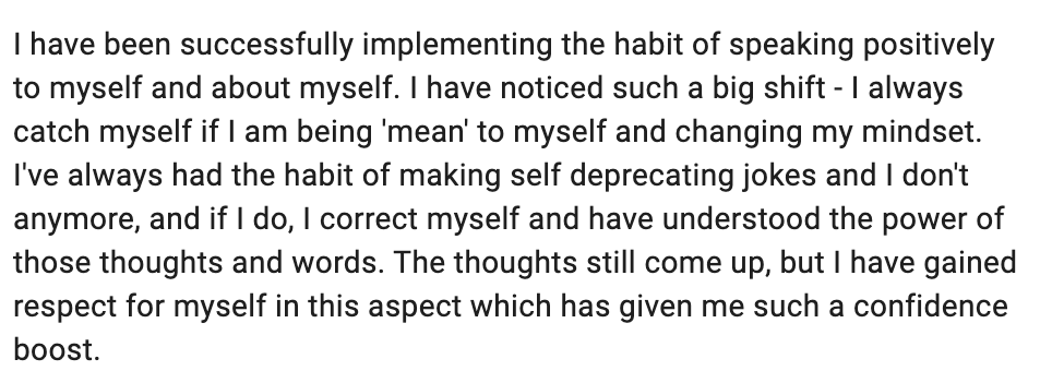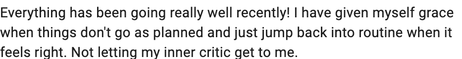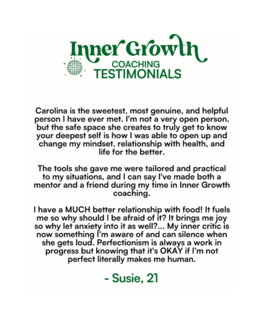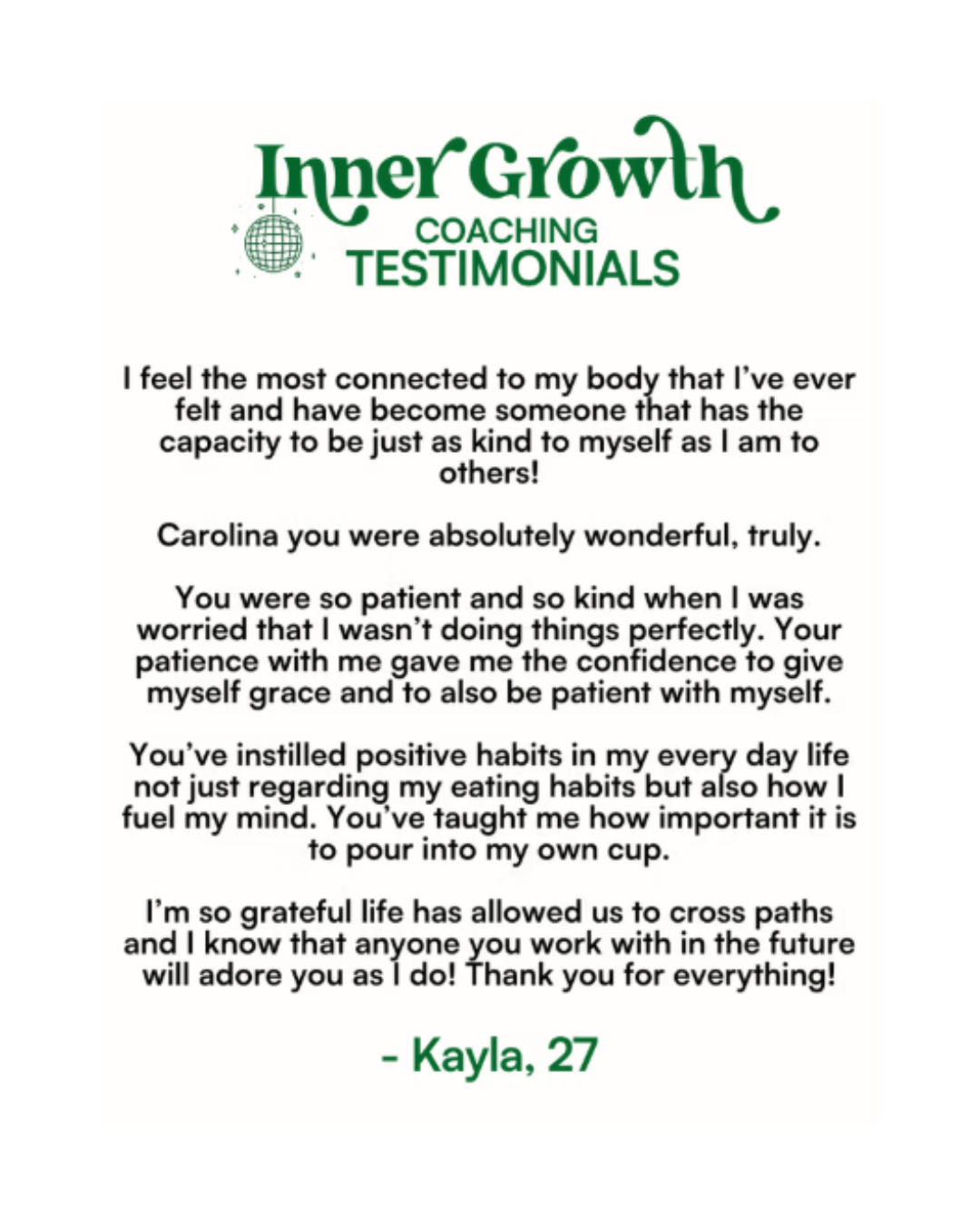 The tools she gave me were tailored and practical to my situations, and I can say l've made both a mentor and a friend during my time in Inner Growth coaching. I have a MUCH better relationship with food! It fuels me so why should I be afraid of it? It brings me joy so why let anxiety into it as well?... My inner critic is now something I'm aware of and can silence when she gets loud. Perfectionism is always a work in progress but knowing that it's OKAY if I'm not perfect literally makes me human.