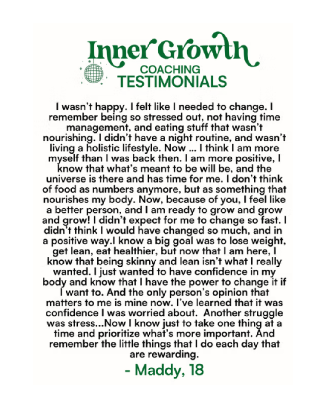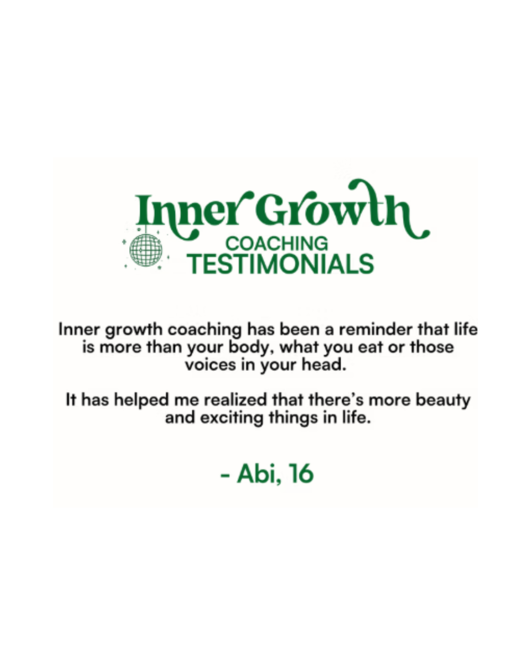 Inner growth coaching has been a reminder that life is more than your body, what you eat or those voices in your head. It has helped me realized that there’s more beauty and exciting things in life.